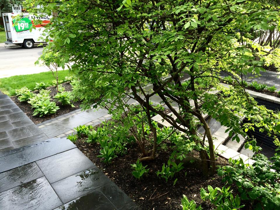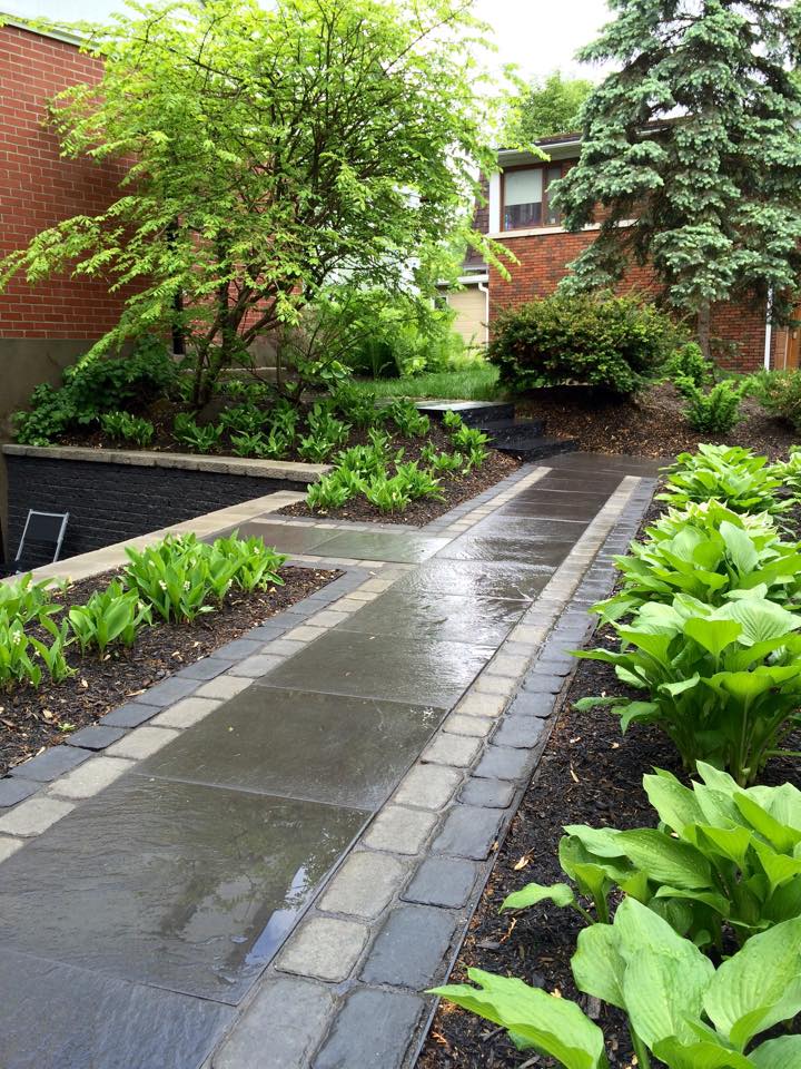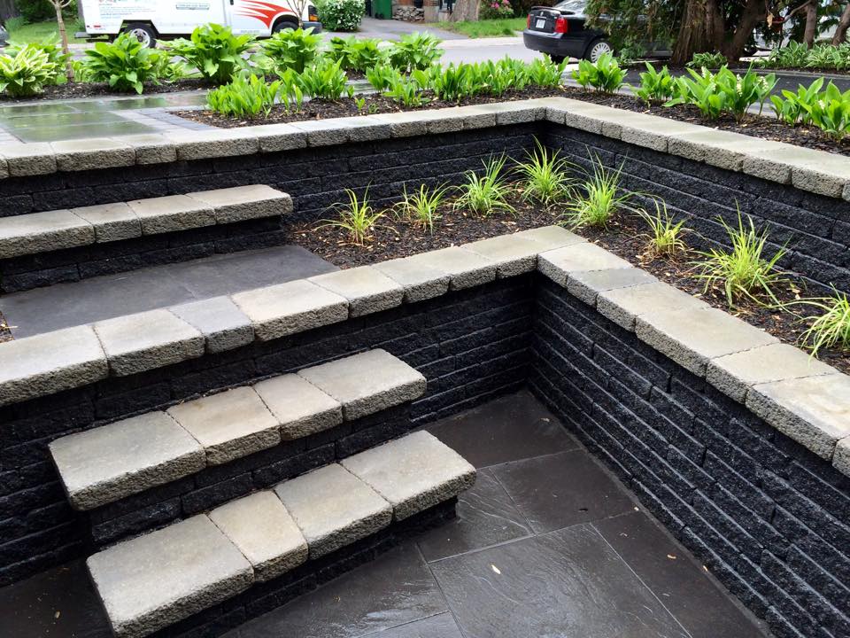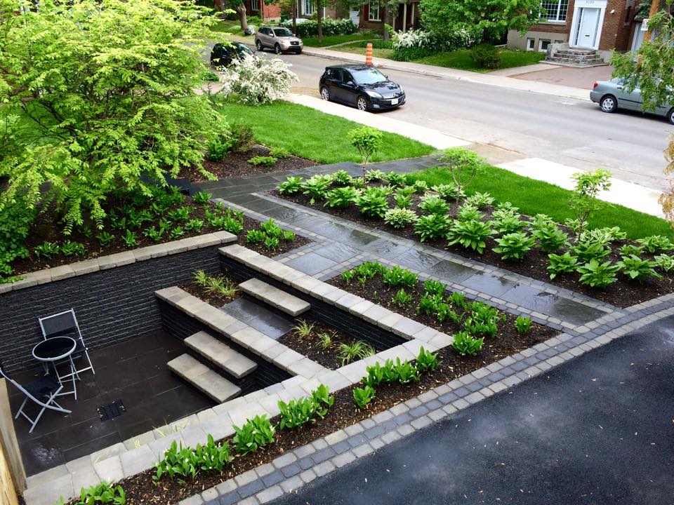 Aménagement de façade (Sentiers, murets, escaliers, terrasse, stationnement et plantations) réalisé en 2013.